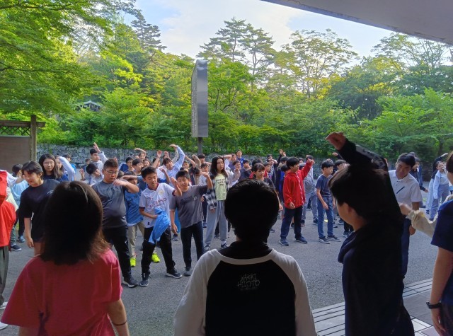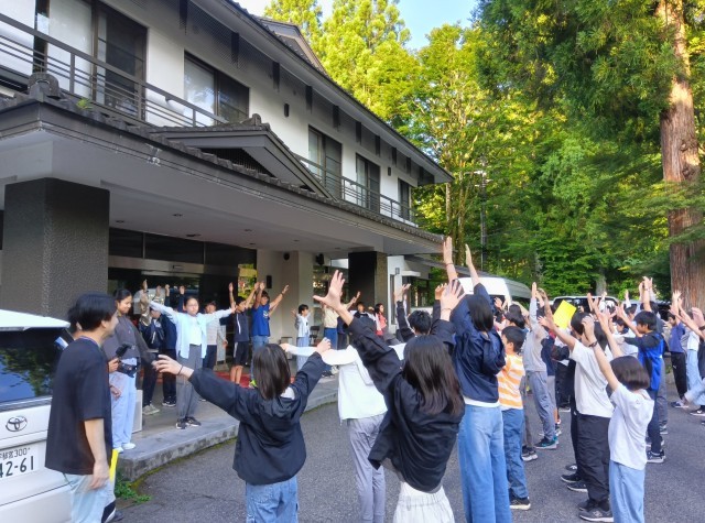 おはようございます。日光で迎える朝です。朝会のラジオ体操で目を覚まし、朝ごはんです。みんな元気です。よい天気です。いい日になりそうです。