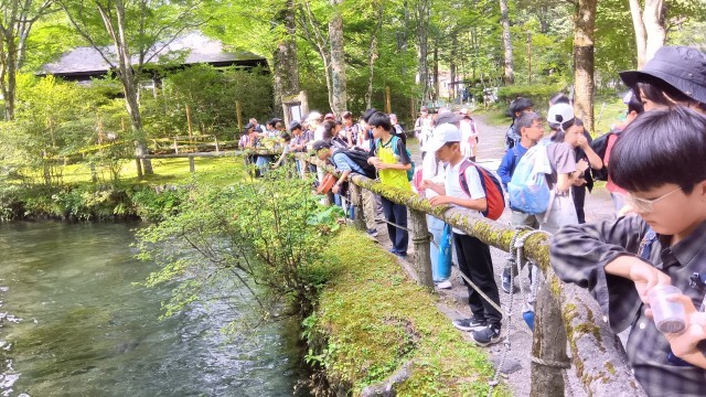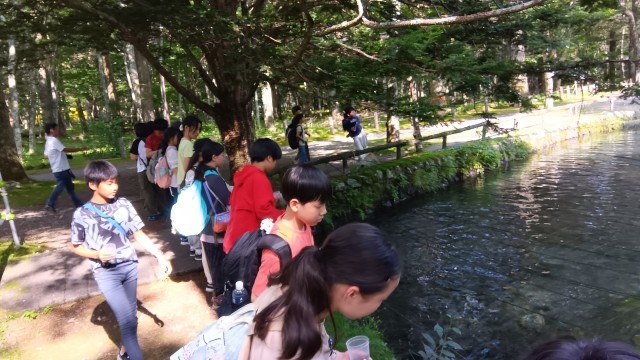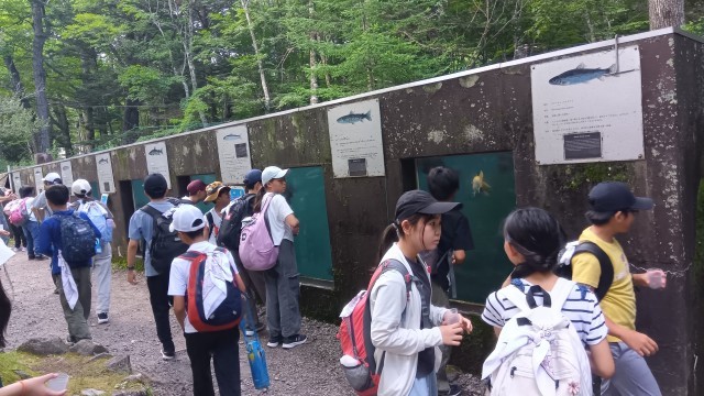 さかなと森の観察園です。様々な魚がいる池を回ってエサをあげることができます。清流に住むマス類がいます。気持ちのよぃ森の中でみんな魚との触れ合いを楽しみました。
