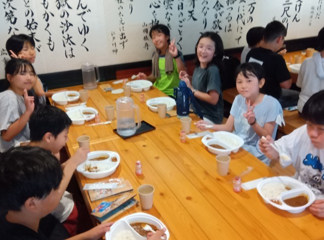 お昼ごはんはカレーライスです。お狩り場という食事処で食べます。みんな元気です。後半どうしようかと話すグループもありました。暑さが厳しいこととお昼過ぎから雨の予報になっているので30分予定を早めます。日光江戸村を午後1時に出発する予定です。