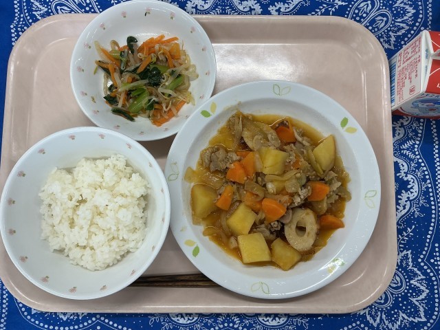 本場では骨付きの豚肉だそうですが、給食では小間肉で作りました。