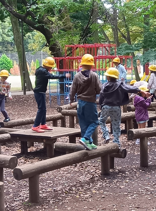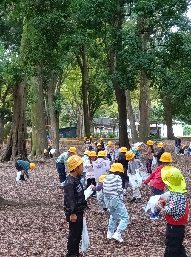 どんぐりや木の葉をたくさん拾い、拾い終わったら遊具で遊びました。柔らかい土の上を思い切り走り回って楽しんている子もいました。どんぐりはこのあと工作に使う予定です。