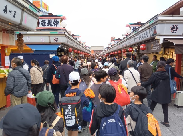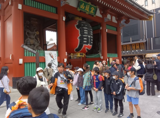 浅草です。仲見世を見学して浅草寺です。人がたくさんですがみんなよく見ていました‥