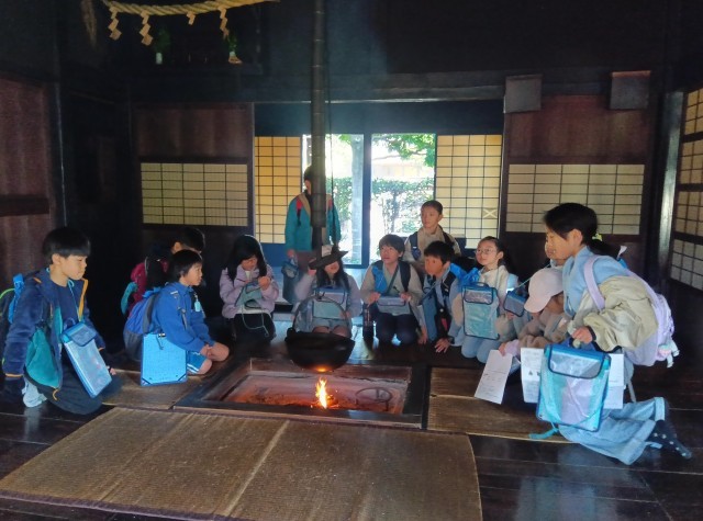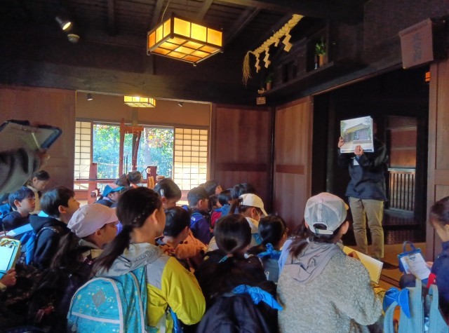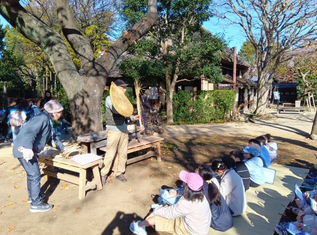 古民家の中で 説明を聞いたり 藁を使った体験活動したりします。とても素敵な公園です。みんな興味深く 楽しそうに過ごしています。
