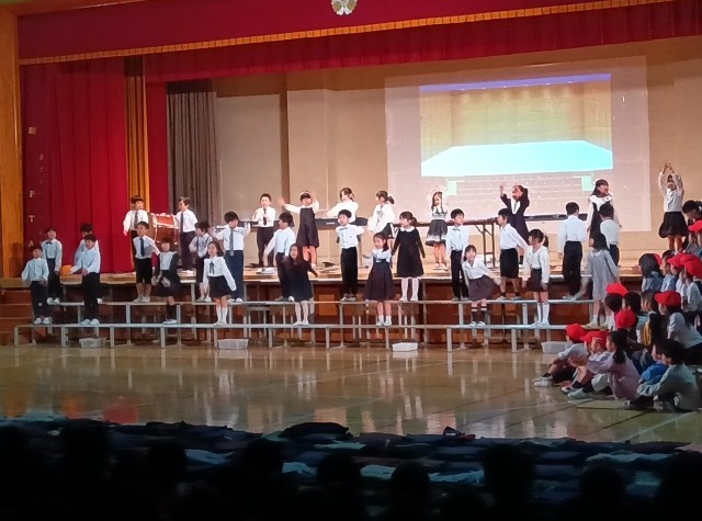「未来からのタイムカプセル〜キラキラの毎日をつめこんで」です。入学してからの1年間点、日々 学んだことを劇にしました。国語の場面あり 体育の場面あり、音楽の場面あり、生活科の場面あり点、子どもたちの楽しい毎日の学びが伝わってきました。みんな大きな声で いきいきと表現していました。