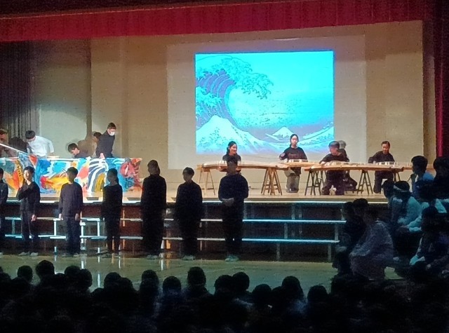 「和の心〜わたしたちが見つけた答え」です。5年生の頃から取り組んできた「和」という大きなテーマを劇で表現しました。 寿司と和菓子 という 強い思いを持って取り組んだ活動を笑いあり 感動 ありの劇に仕上げました。 見ている 子どもたちも大いに盛り上がりました。 最後にはぐっと感動させる素晴らしい内容でした。