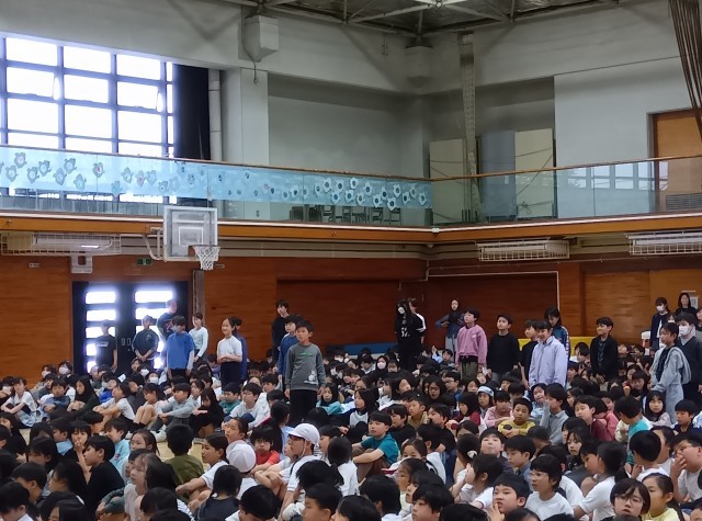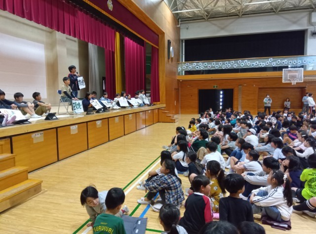 それぞれの委員会の委員長が、委員会を紹介します。 委員会に所属する子どもたちはその場で立ちます。子どもたちのやる気が伝わってくる素晴らしい 集会でした。