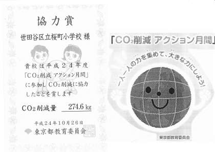 桜町小学校が、東京都教育委員会から、「CO2削減 アクション月間」に参加し、274.6Kgの削減をしたことで、協力賞をいただきました。
