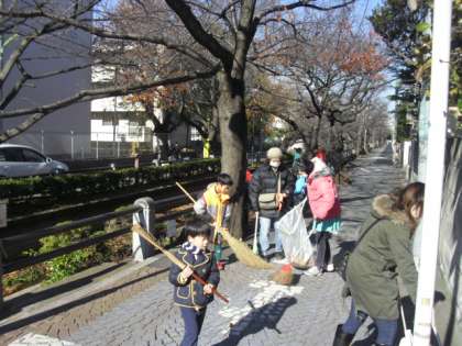 桜町小学校からも児童、保護者の皆様が多数参加していただき、町会の皆様と一緒に呑川川周辺の落ち葉掃きなどの清掃活動を行いました。