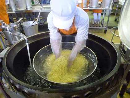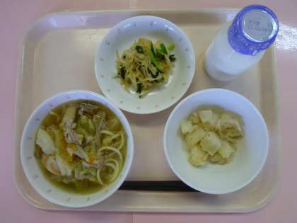 先週の金曜日(12/7)の給食の画像です。「長崎ちゃんぽん」のちゃんぽん麺は、調理員さんがゆでた後に冷たい流水でしっかりとしめます。こうすることで、コシのある麺になります。たくさん食べてくれました。