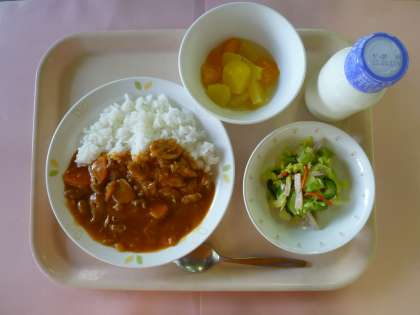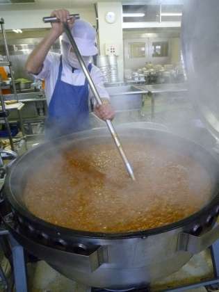 昨日(1/10)の給食の画像です。トマト味の「ハヤシライス」はとてもよく食べていました。左の写真は「ハヤシライス」のルーを大きな釜で煮込んでいる様子です。