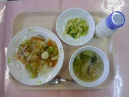 昨日(2/6)の給食の画像です。魚介類や野菜が入った「中華丼」をよく食べていました。