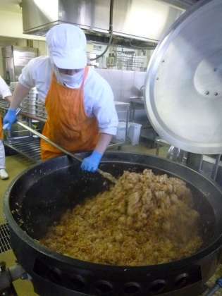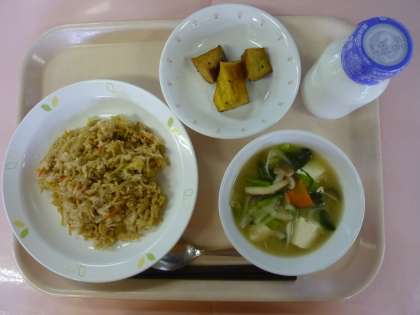昨日(3/11)の給食の画像です。左の画像は、焼きそばとごはんを回転釜で混ぜている様子です。食缶を開けた時は「この料理、なんだろう」と子どもたちは不思議がっていましたが、よく食べてくれました。
