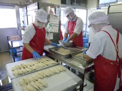 昨日(5/7)の給食の画像です。左の画像は「あじフライ」の衣付けをしている様子です。一つ一つしっかりと衣付けをして、揚げてくれました。