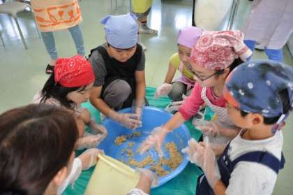 子どもたちには、米こうじと塩をまぜたり、ゆでた大豆を手でつぶしたり。最後はみんなで順番にたらいの中で混ぜて、野球ボール大の大きさに丸めて「えい!」とたるに投げ込みました。