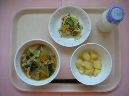 先週の金曜日(5/17)の給食の画像です。めんが好きな子どもたちが多いので「にこみうどん」をたくさん食べてくれました。