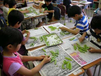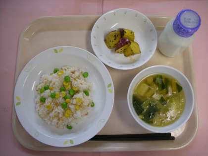 昨日(6/7)の給食の画像です。昨日は1年生がグリンピースのさやむきを行いました。さやからむいたグリンピースは、大きな釜でゆでると鮮やかな緑色になりました。それを「さけピースごはん」に入れました。1年生は自分がむいたグリンピースの入ったごはんを嬉しそうにたくさん食べていました。
