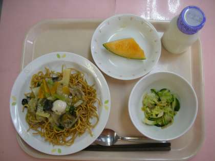 先週の金曜日(6/7)の給食の画像です。カリカリの麺に中華あんをのせた「五目かた焼きそば」は、麺を食べるのに苦労する子どももいましたが、よくかんで食べてくれました。