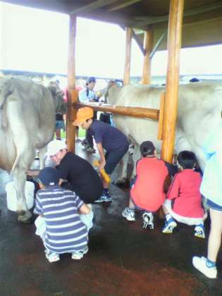 牛2頭で搾乳体験。「お乳は思ったより温かかった。」