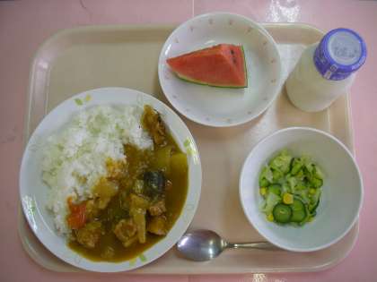 昨日(7/17)の給食の画像です。一学期最後の給食は、夏野菜のカレーライス、牛乳、福神漬け、枝豆サラダ、スイカでした。