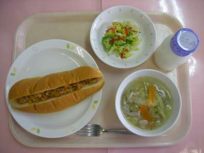 昨日(11/6)の給食の画像です。「大豆ミートサンド」には、名前の通り「大豆」が入っています。豆類が苦手な子も、みじん切りにすることで気付かずしっかり食べてくれました。