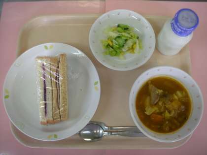 先週の金曜日(11/29)の給食の画像です。「二色サンドイッチ」は「ハムチーズ」と「ブルーベリー」の2種類を作りました。