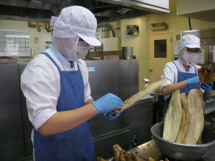 連休も終わり、いよいよ今日から学校が始まります。今日は「子ぎつねごはん」です。名前の由来は、きつねの大好物とされる「油揚げ」が入っているからです。「油揚げ」は味がよくしみこむと同時に、よいだしが出るので、しっかり煮て美味しい「こぎつねごはん」を作りたいと思います。