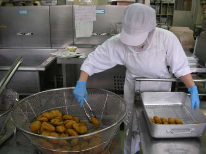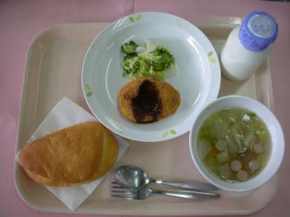 昨日(5/8)の給食の画像です。「コロッケ」をつくりました。子どもたちはパンに挟んで、大きな口を開けておいしそうに食べていました。