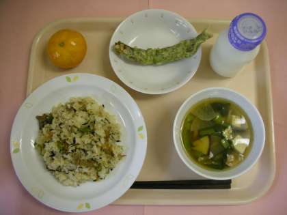 先週の金曜日(5/30)の給食の画像です。カルシウムたっぷりの「ししゃもの天ぷら」は青のりをまぶすことで、子どもたちにも食べやすくなります。