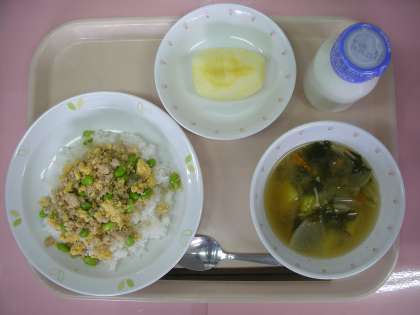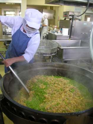 昨日(10/7)の給食の画像です。左の画像は、卵・とり肉・枝豆の3種類の食材を使った「三色丼」を大きな釜で作っている様子です。