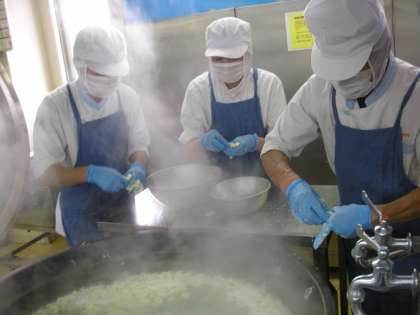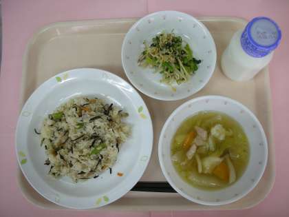 昨日(10/9)の給食の画像です。郷土料理給食であり、岩手県の「ひっつみ」を作りました。小麦粉と水で作った生地を調理員さんが一生懸命ちぎって、「ひっつみ」を作ってくださいました。
