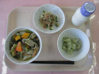 昨日(12/9)の給食の画像です。郷土料理給食であり、山梨県の「ほうとう」でした。平たく太いほうとう麺にびっくりしていました。