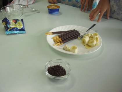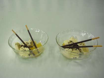 今日はクラブがありました。料理クラブでは、パフェを制作しました。買い物はすべてボランティアとして6年生の4人が買ってきてくれました。材料は、マンゴー缶詰、バニラアイス、チョコレートシロップ、バナナチョコスプレーです。