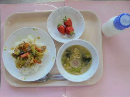 昨日(2/16)の給食の画像です。くだものは「いちご」であり、「さがほのか」という種類を出しました。「いちご」は子どもたちにも人気のくだものです。