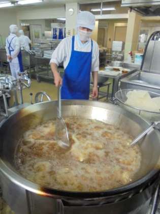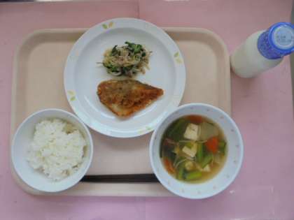 昨日(2/25)の給食の画像です。「たらの香味揚げ」が出ました。ねぎがたくさん入ったタレを絡めました。