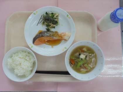 昨日(3/16)の給食の画像です。魚の中でも「鮭」は人気であり、甘じょっぱいタレのかかった鮭の照り焼きは、人気の和食メニューです。