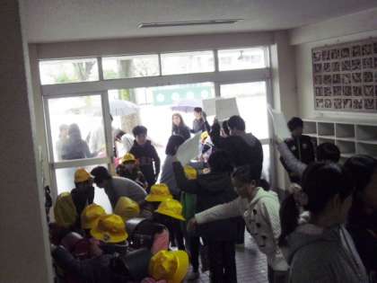雨の玄関は大混乱ですが、6年生は「○組こっちだよ」と呼んで、