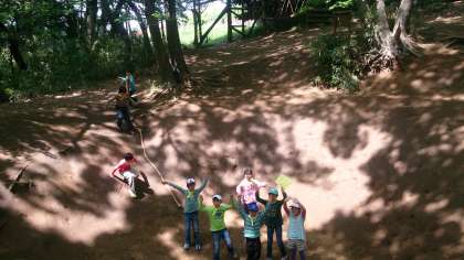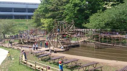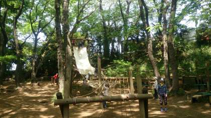 遠足でつくし野アスレチックにやってきました。元気な4年生はいろいろな遊具に挑戦しています。今日はとても暑いので、水辺の遊具が大人気です。夢中になって遊んで、池に落ちる子が続出しています。