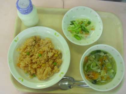 今日の献立 チキンライス、 ベーコンと野菜のスープ、 アスパラのサラダ、牛乳