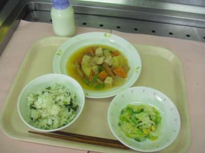 5月18日の給食のこんだて あおなとじゃこのごはん そぼろに コーンサラダ 牛乳