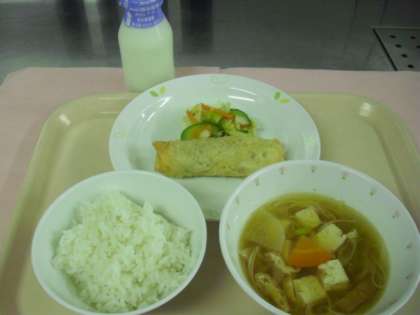 今日の献立 ごはん 春巻き ラーパーサイ あんかけ汁 牛乳