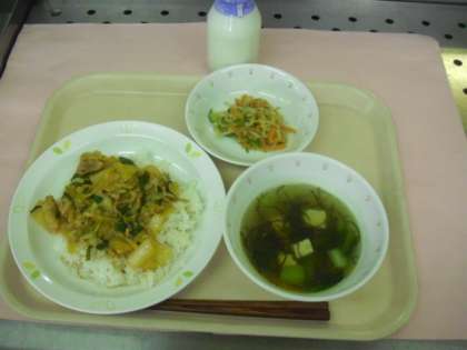 今日の献立 キムチ丼、もずくスープ、切干大根のサラダ