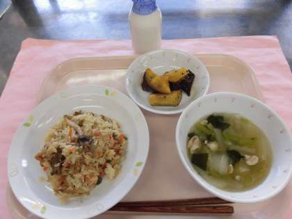 今日の献立 きこのごはん 牛乳 吉野汁 大学いも