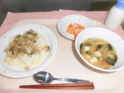 今日の献立 三色丼 牛乳 みそしる 大根の甘酢かけ