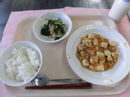 今日の献立 ごはん 牛乳 麻婆豆腐 ほうれん草サラダ
