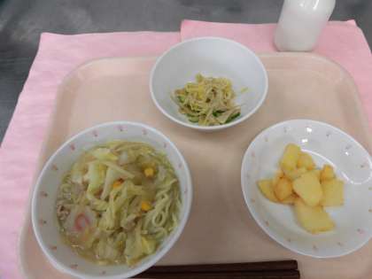 今日の献立 みそラーメン 牛乳 スパイシーポテト 白菜の中華サラダ