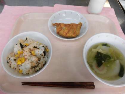 今日の献立 鮭わかめごはん 牛乳 ワンタンスープ ジャンボぎょうざ