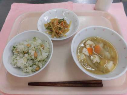 今日の献立 豆ごはん 牛乳 いわしのつみれ汁 じゃがいもきんぴら