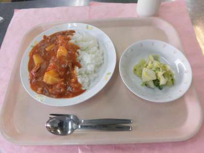 今日の献立 ハッシュドポークライス 牛乳 りんごと白菜のサラダ