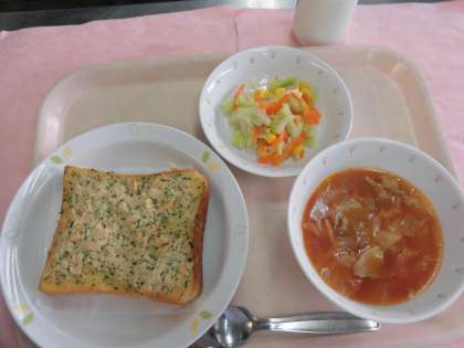 今日の献立 ツナトースト 牛乳 ABCスープ コーンサラダ