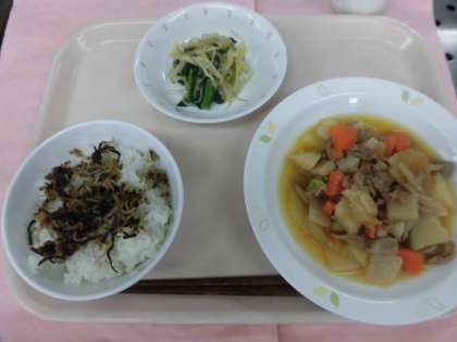 今日の献立 ごはん 牛乳 かみかみ佃煮 豚肉と大根のうま煮 和風サラダ